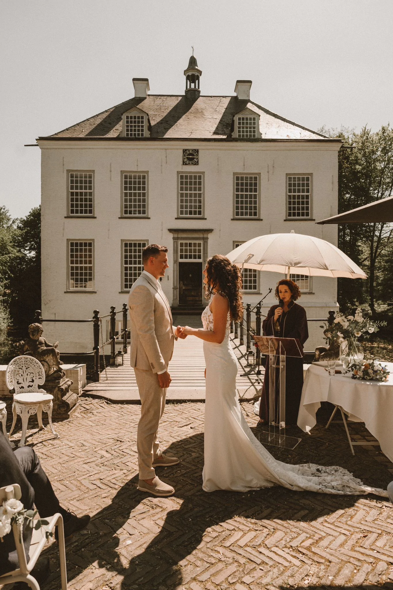 Op 9 september zijn wij getrouwd door Ellen. Na een korte kennismaking hebben wij een vrijblijvende afspraak gemaakt om te kijken of er een klik was tussen ons en Ellen en dat was er eigenlijk meteen. Ellen is makkelijk benaderbaar en denkt vanaf moment één meteen mee met het plannen van de huwelijksceremonie. Doordat zij ruime ervaring heeft, was dat voor ons een waardevolle aanvulling. De ceremonie was in een woord geweldig. Zoals wij zijn als mens, hoe wij in het leven staan, de liefde voor elkaar, weet zij op een sprankelende, humoristische en krachtige manier te verwoorden in de ceremonie. Wij hebben een aantal van onze dierbaren aangedragen die iets over ons en onze liefde voor elkaar wilden vertellen. Ook wij mochten iets vertellen over onze getuigen. Dit alles maakte het een heel persoonlijk verhaal. We hebben ontzettend veel complimenten gekregen over de trouwceremonie hoe liefdevol, persoonlijk en vol humor deze was. Ellen was voor ons echt de kers op de taart op onze dag!