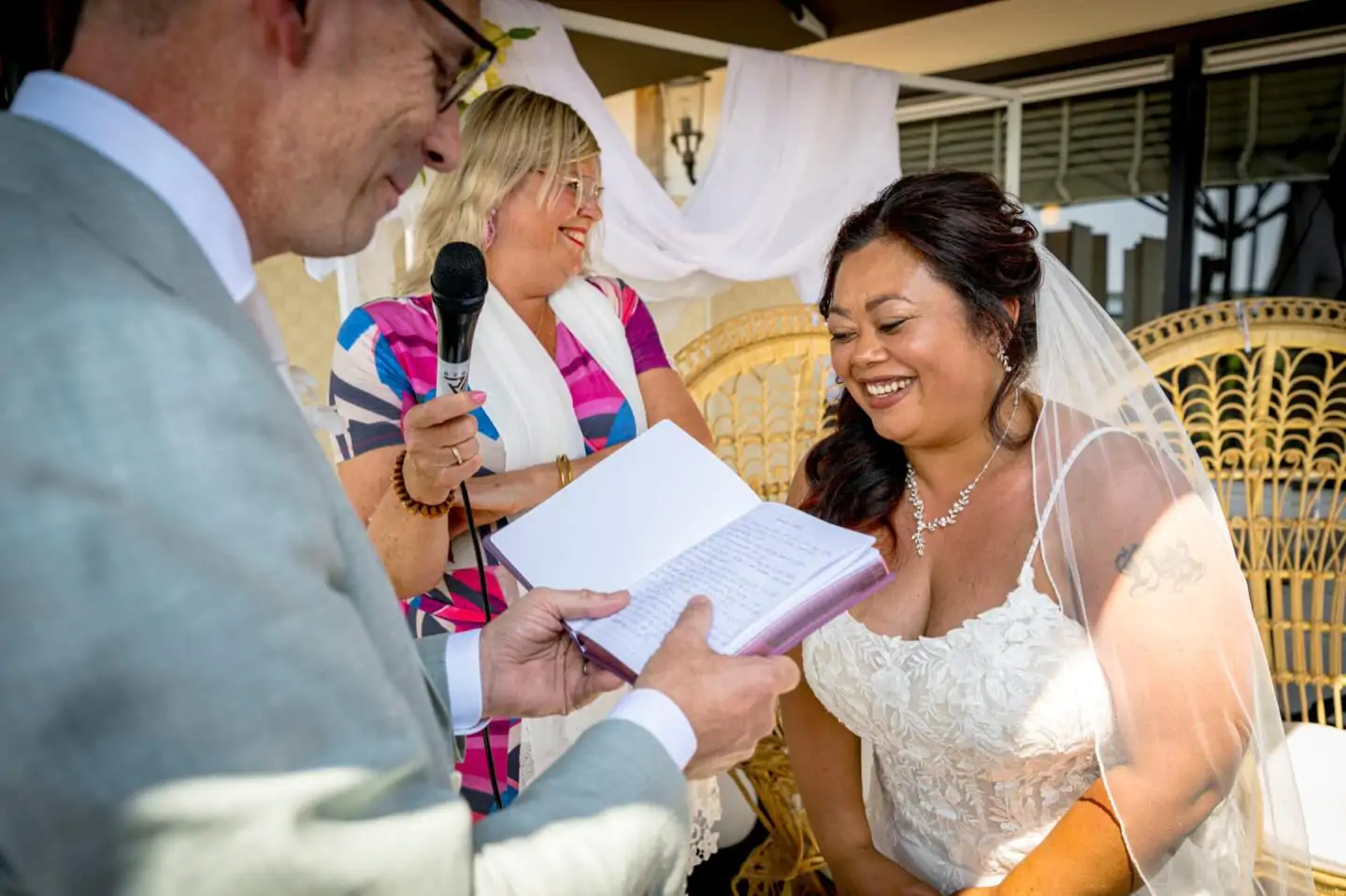 We zijn inmiddels terug van onze honeymoon, dus nu even alle tijd om jou nog een berichtje te sturen. We kijken met heel veel blijheid terug op onze huwelijksdag. We hebben hard gelachen om jouw verhaal en het ook met veel plezier terug gelezen op papier. Hartelijk bedankt! Wat me van de dag misschien nog wel het meeste is bijgebleven is het moment waarop je constateerde dat wij al een biertje hadden. Je zei: oh, dan lust ik er ook wel 1! Super leuk dat je zo goed aansluiting wist te vinden bij ons en de sfeer die we graag wilden. We hebben van zoveel mensen terug gehoord dat ze de ongedwongenheid heel erg prettig vonden, dus dank dat je daar zo in mee wist te gaan