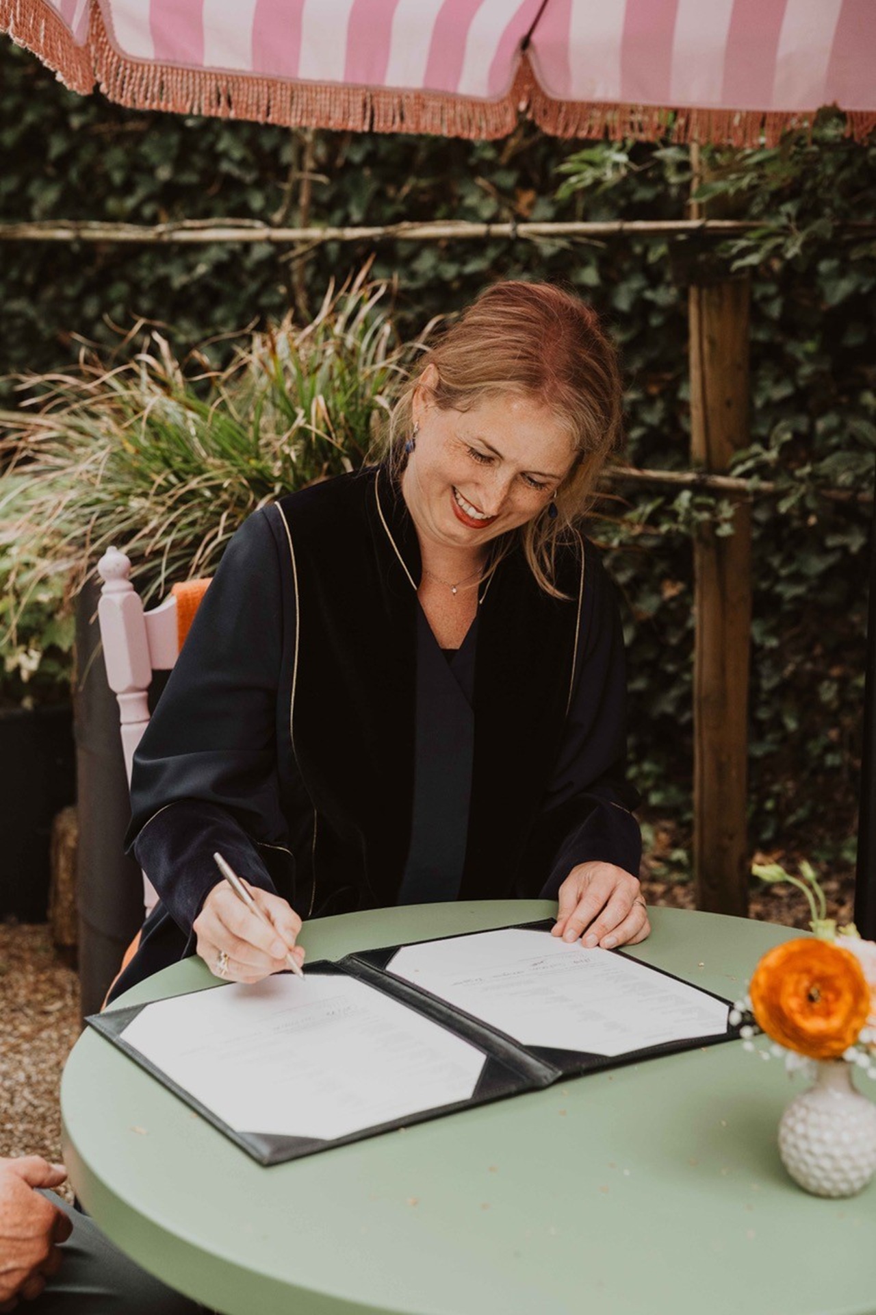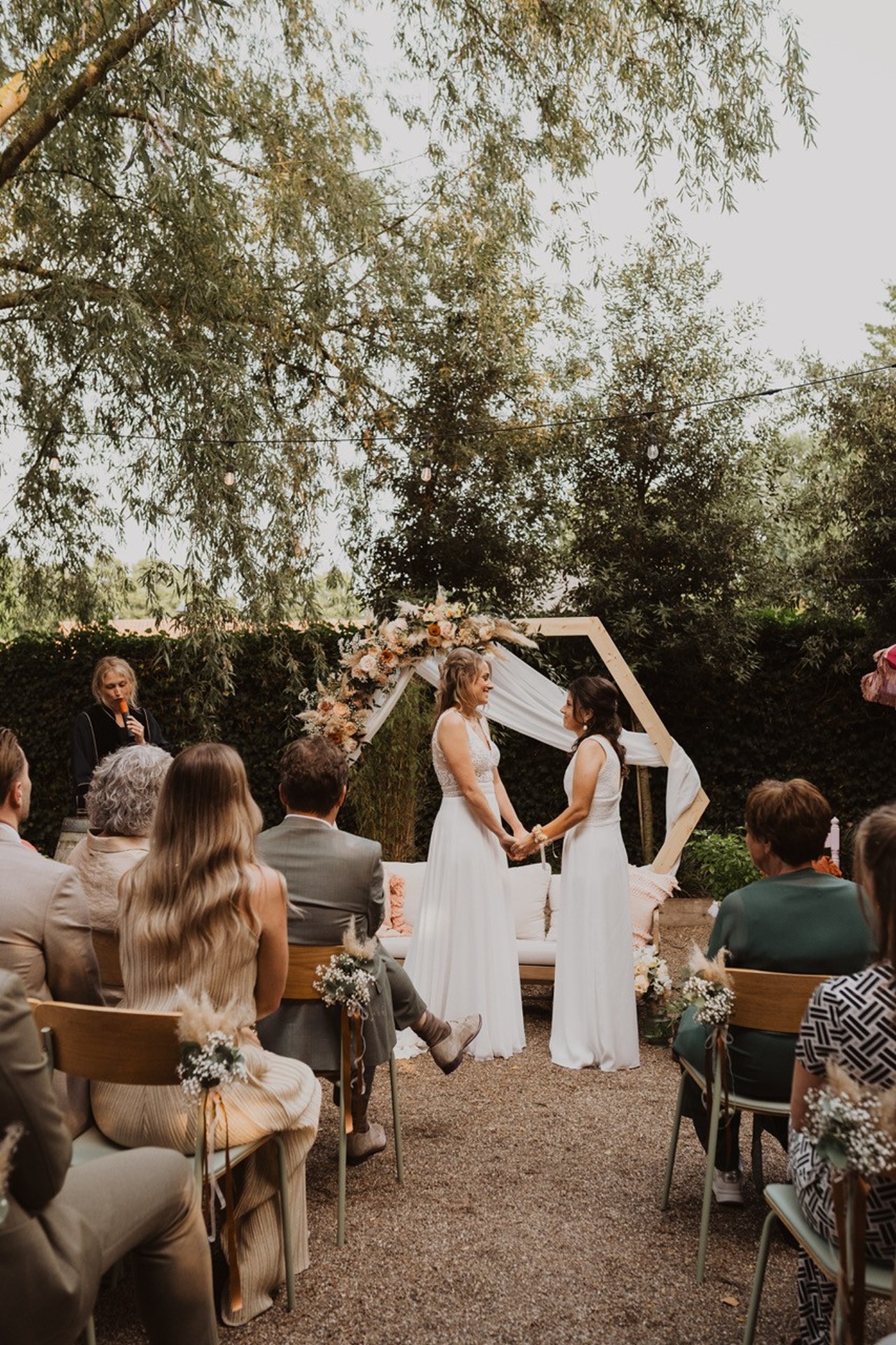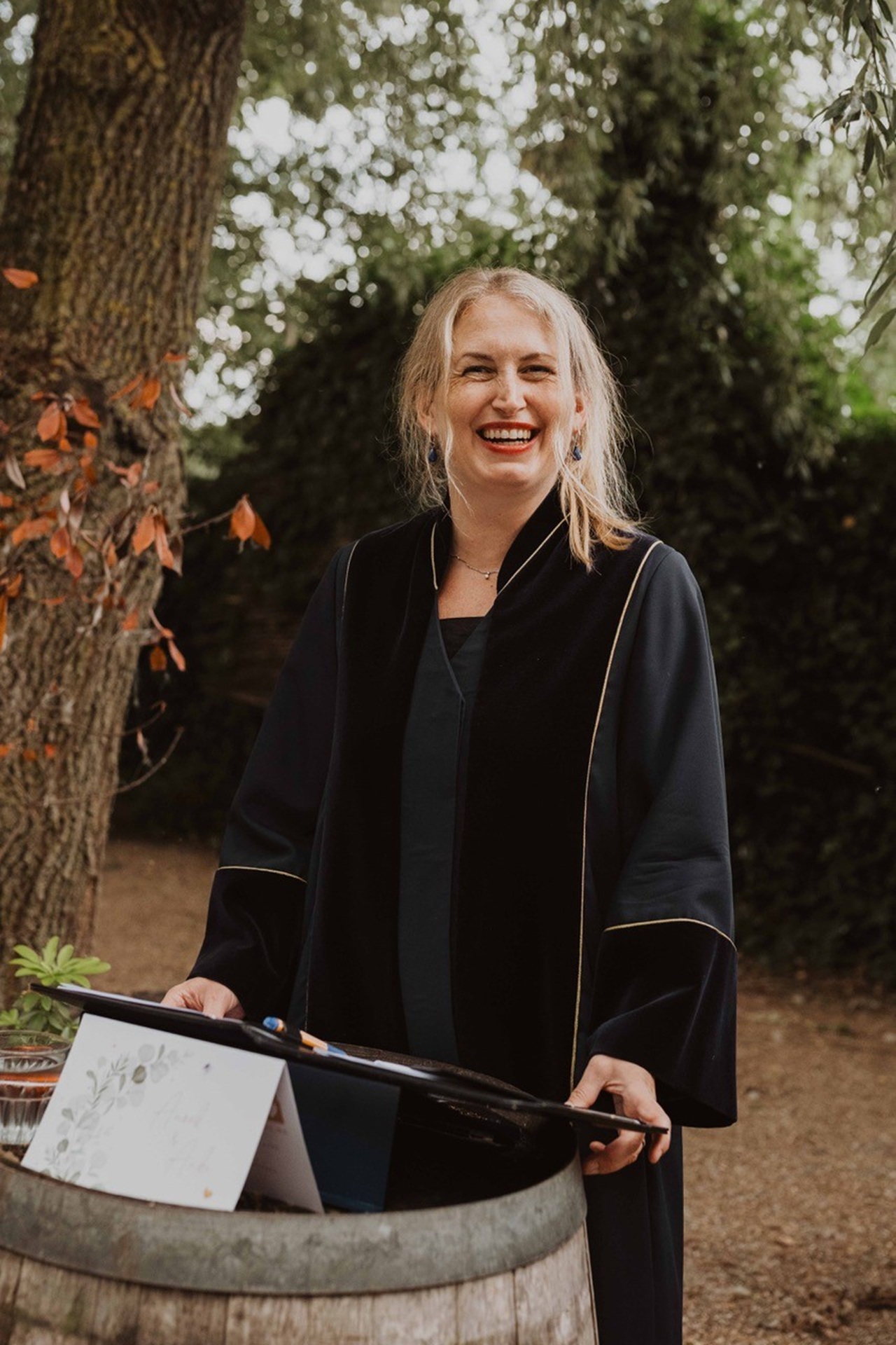 Nieke is a wonderful BABS! We are an international couple (Dutch-English) and although almost all Dutch BABS we met with, we met four in total!, could speak English, Nieke had a naturalness to her conversation in English that made such a difference. She is so friendly and open, and we immediately clicked with her in our first meeting. Once we had chosen Nieke, she also assisted us with the legal side of things too with the gemeente, witnesses, licences etc. which helped a lot during what can be a stressful time. And after our second chat which took place at our house, a few weeks before the wedding, we came away feeling like we had known Nieke for years! Nieke really took the time to get to know us, both individually and as a couple. It was so important to us that our friends and family could understand, feel included and relate to us during our ceremony, and Nieke made sure that was top priority. Nieke also took the time to call some of our friends and family in the weeks leading up to the wedding, so that she could get different perspectives and stories. She put those she talked to completely at ease and it was so meaningful to have their anecdotes and feelings shared during our special day. The ceremony was filled with love and laughter and importantly, was so unique to us: all our guests were amazed by how personal it was, definitely not your standard legal ceremony! If you are looking for a kind, funny, smart and joyous celebrant then you cannot do better than Nieke.