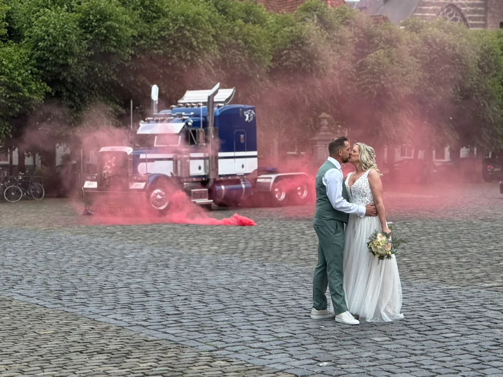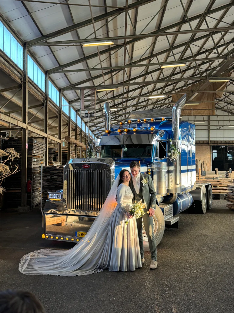 De truck was echt een showstuk van onze bruiloft! Wim was er al vroeg om te oefenen, zodat onze pa ons de hele dag kon rijden. De truck glom en was goed onderhouden. De passie straalde er vanaf, zowel van Wim als z’n truck!