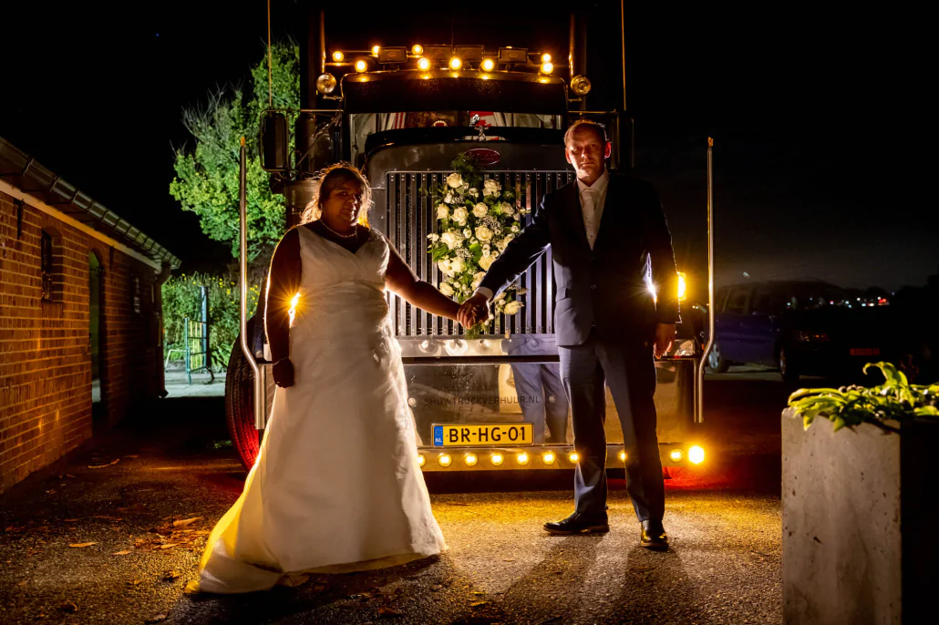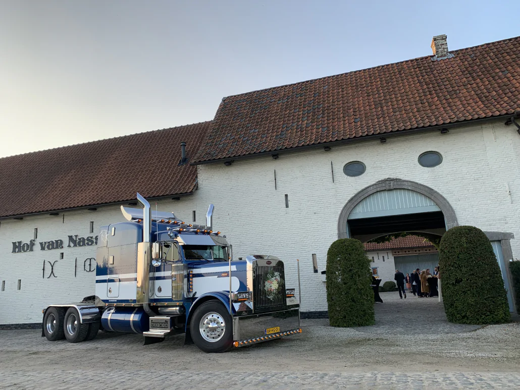 Ook bij de feestzaal kan de trouwtruck een bijzondere uitstraling geven. Onze blauwe Peterbilt of rode Kenworth kan bij de ingang geplaatst worden, waar de verlichting zorgt voor extra sfeer terwijl alle gasten binnenkomen.