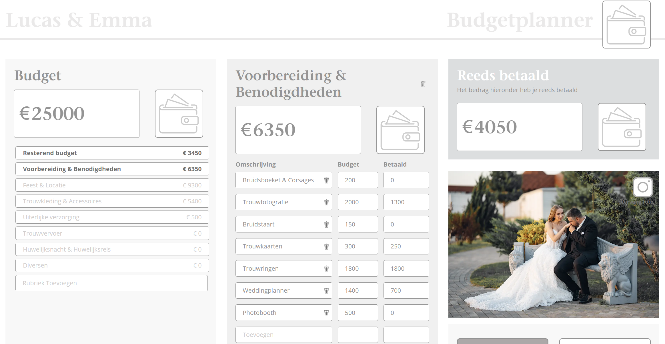Op deze pagina vind je jullie budgetplanner. Eenvoudig, overzichtelijk en toch heel uitgebreid, zodat je niks vergeet! Klik onder ‘Budget’ het onderdeel aan waarvan je alle details wilt bekijken of scroll verder naar onderen voor een totaaloverzicht. Pas het totaaloverzicht naar wens aan door per blok op het prullenbak-icoon te klikken om een blok te verwijderen.
