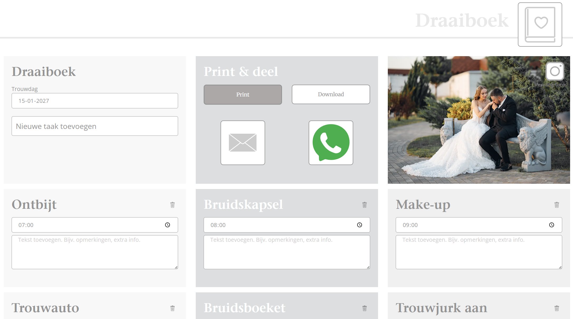 Het is geen geheim: elke bruiloft is tot op de minuut gepland. Geef hier vorm aan jouw eigen draaiboek voor de bruiloft. Er zijn al heel veel onderdelen ingevuld als voorbeeld, maar alle taken zijn aan te passen. Verwijder bestaande taken of voeg eenvoudig nieuwe toe aan het draaiboek. Draaiboek klaar? Ook deze kan je eenvoudig met je ceremoniemeester delen via WhatsApp of e-mail, of exporteer je draaiboek.