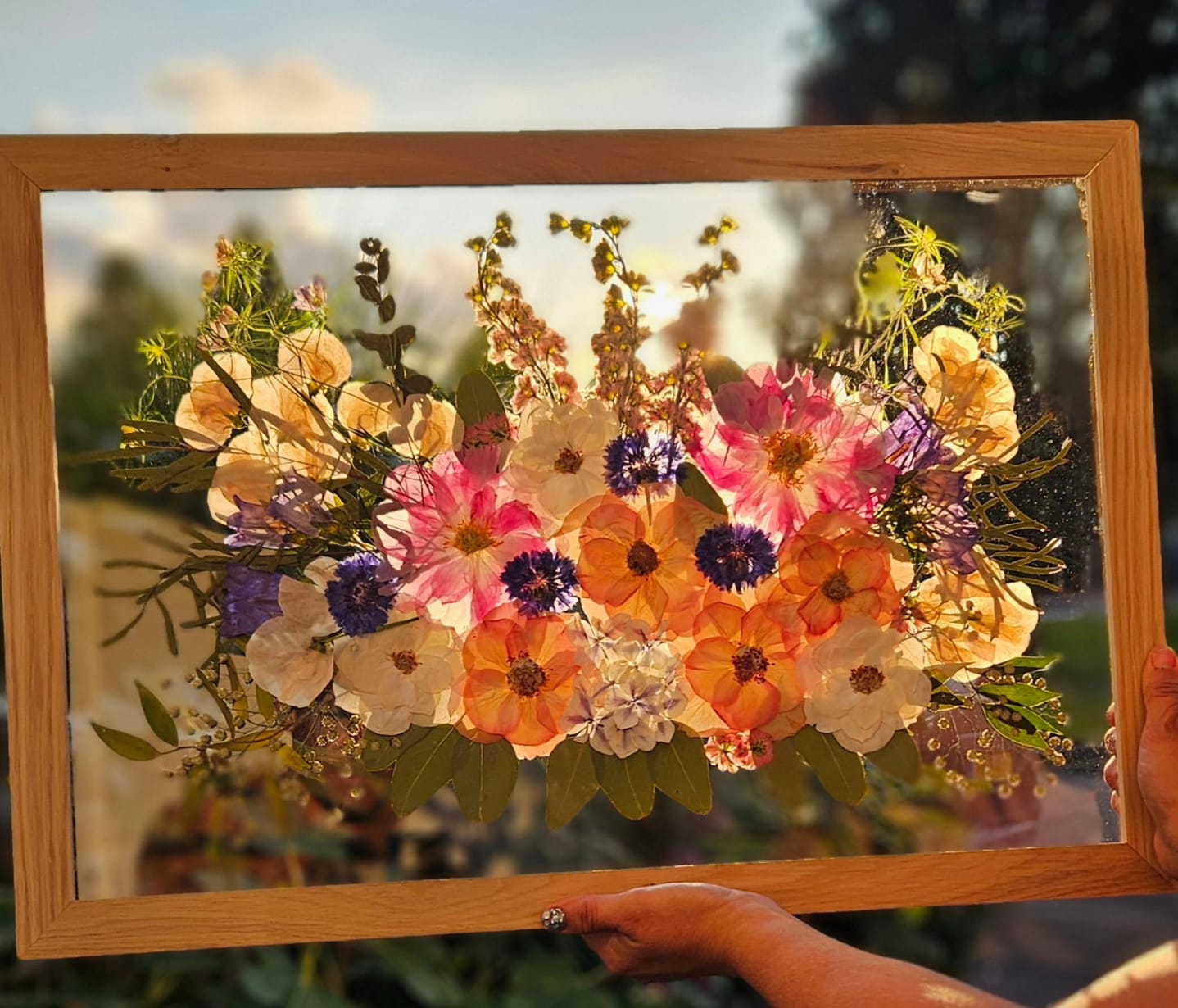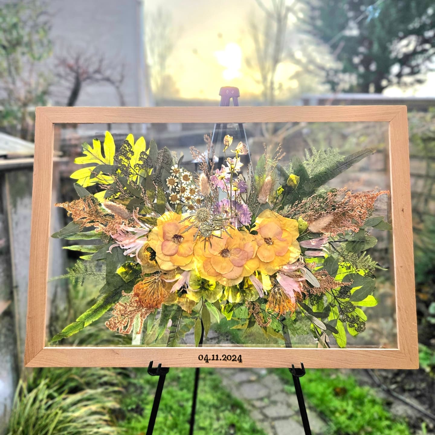 Charlotte heeft echt een prachtig kunstwerk gemaakt van ons trouwboeket! De communicatie met verloopt enorm fijn en alles is super makkelijk in overleg geregeld. Door het nieuwe ArtGlass lijkt het bijna alsof er geen glas in zit. Heel erg tevreden!