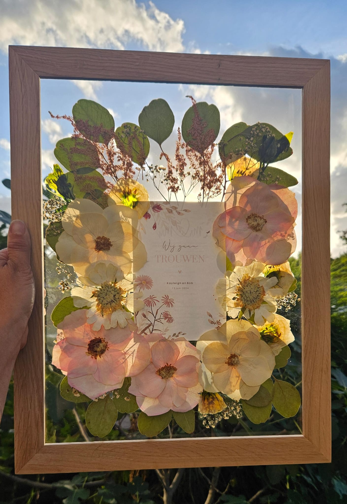 We zijn zo blij met wat Charlotte voor ons heeft gemaakt! Ons trouwboeket had de dag zelf wat weinig water gehad, maar ze heeft het prachtig geperst, gedroogd en zelfs bijgekleurd. Nu zit het, samen met onze trouwkaart als middelpunt en de bloemen eromheen, schitterend ingelijst. Een supermooie en blijvende herinnering aan onze dag. dankjewel Charlotte! 🌸✨