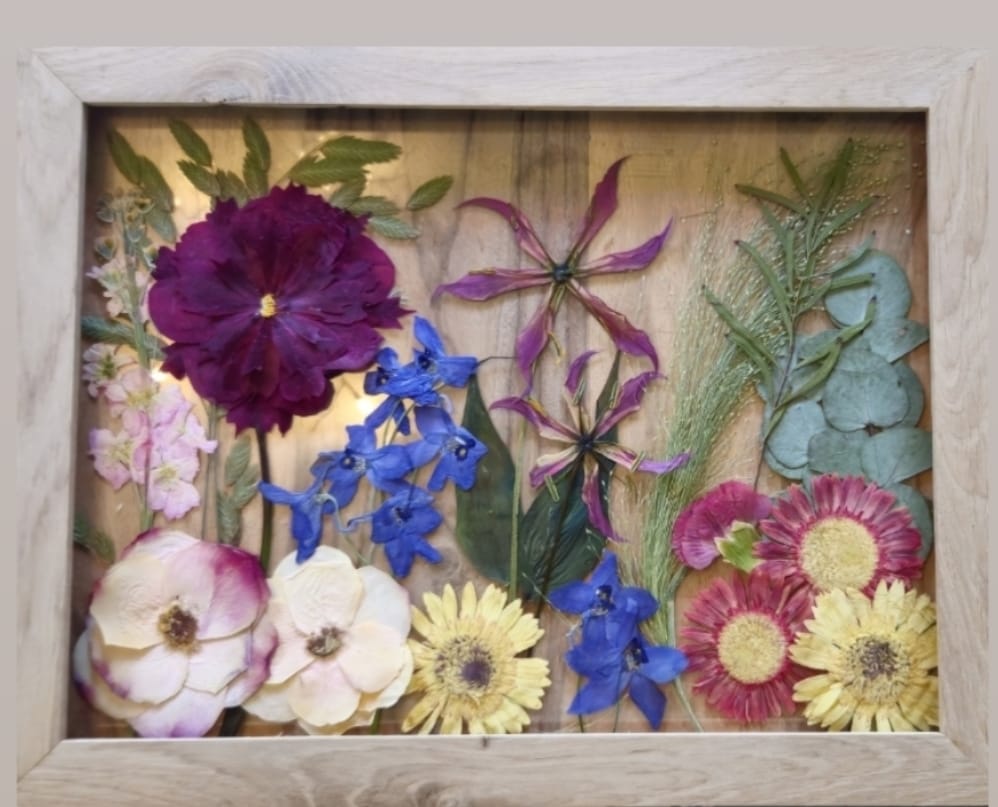 Bloemen blijven een natuurproduct en kunnen in de loop der tijd hun felle kleuren verliezen. Hoe lang dit duurt, hangt af van de bloemsoort en de plek waar het kunstwerk hangt. Door de lijst niet in direct zonlicht of in een vochtige ruimte op te hangen, blijven de kleuren het langst mooi.
