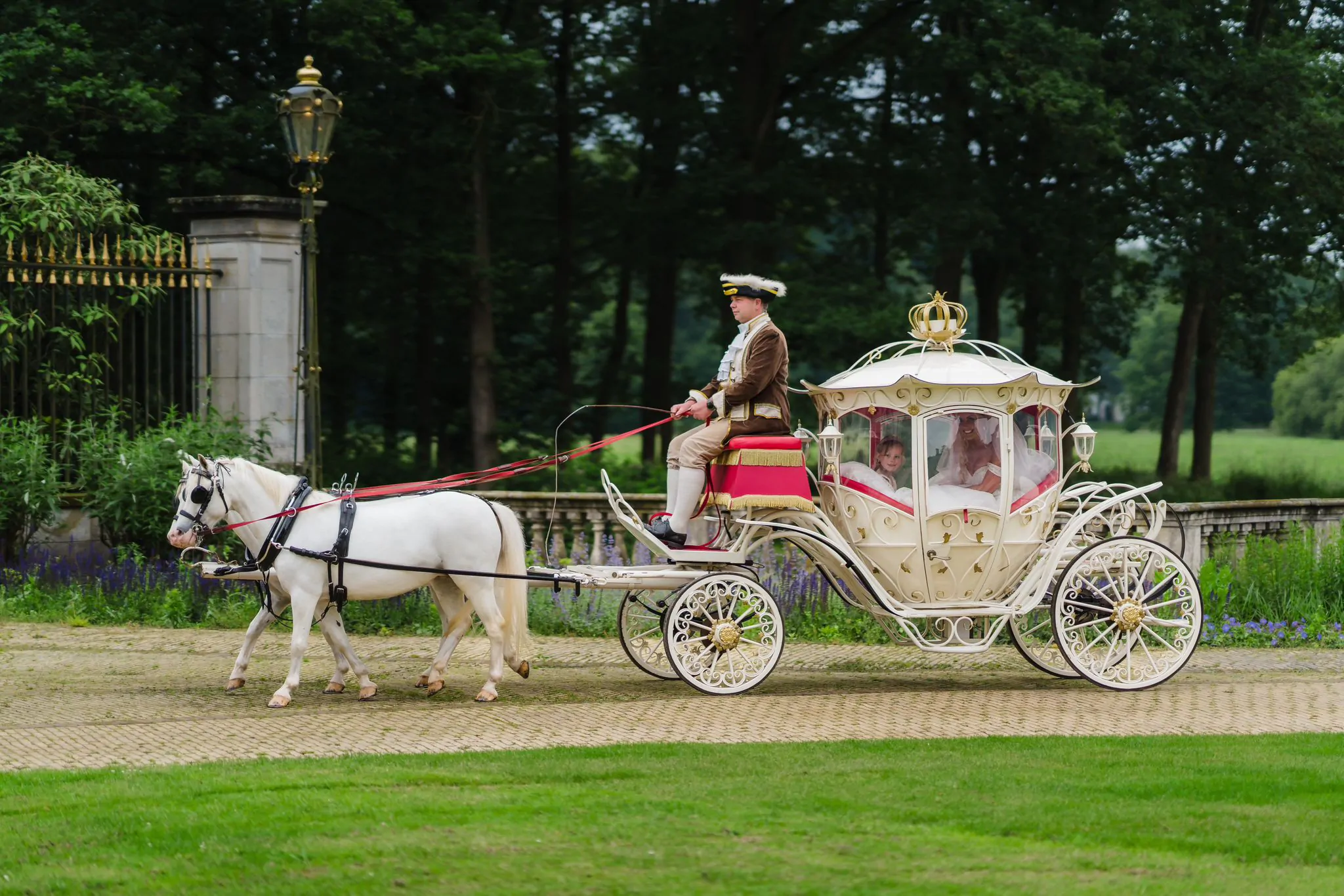 Prachtige koetsen, zoals in een sprookje, getrokken door mooie, lieve witte pony's gereden door professionals geven uw dag/gelegenheid dat extra "wow" effect!