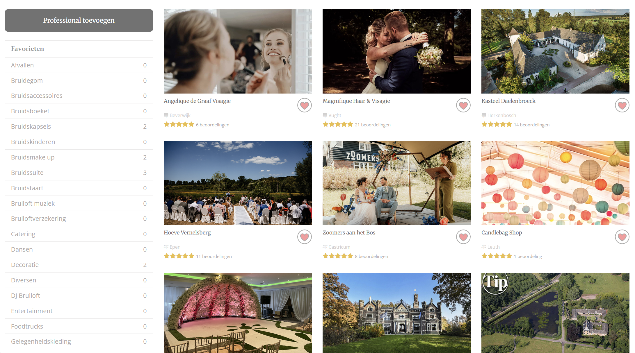 Op deze pagina vind je al jouw favoriete leveranciers terug in een handig overzicht. Met behulp van het linker menu filter je op jouw favorieten per rubriek. Voeg een nieuwe favo leverancier of winkel toe door op de knop ‘Professional toevoegen’ te klikken in de rubriek waar je nog geen favorieten hebt. Ben je lekker aan het scrollen door alle leveranciers op de website? Voeg dan een favoriet toe door op het hartje te klikken op de overzichtspagina van leveranciers.